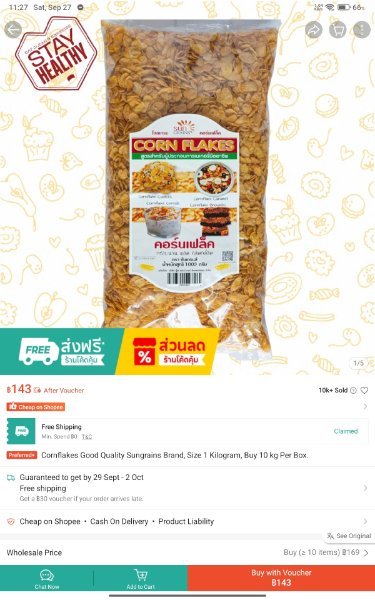 September 27, 2025Sep 27 Shopping on LAZ (on laptop) to restock our cornflakes, in cart, then to app, to order, and no advantage this time. Advantage on LAZ, only when ordering 2 pcs at a time, vs 4 in same order, with shipping and price per bag is higher. I pc per order even higher. Better to order 2 pcs, on separate orders. 1 pc ttl price = ฿189 2 pcs ttl price = ฿374 4 pcs ttl price = ฿812 Call wife in to pay, and before completing, she searched Shopee for same, and found it ฿36 cheaper per bag, so ordered 4 bags on that. After order complete, asked her to send me link to post here, and she opened it again, and the price now ฿36 more, matching LAZ price. Ordered @ ฿143 vs ฿179 per bag. Now same price on LAZ & Shopee + S. Here's the link, incase it opens for you at ~฿143 + shipping. Don't change page, put in cart/basket right away. Strangely the have an 'official' page on Shopee, but @ ฿190 + S. See BritMan2 post below: ... So anyone else, wanting, ignore my link and search product... " คอร์นเฟลคตราซันเกรนส์ บรรจุ " / "Sungrains brand corn flakes" Like these CF, as stay crisper longer in milk than Nestle', and only 3 ingredients. https://shopee.co.th/product/64206564/13790041822?d_id=b88cf&rModelId=78707094882&uls_trackid=53q26r9b00r6&utm_content=4UdjnFvtXhcqAmw1KuUFyDSetG9m&vItemId=44315081466&vModelId=266247949554&vShopId=1449018616&is_from_login=true Same store on LAZ: https://www.lazada.co.th/products/i4286463130-s17025744220.html?urlFlag=true&mp=1&tradePath=omItm&tradeOrderId=1028827205269891&tradeOrderLineId=1028827205369891&spm=spm%3Da2o42.order_details.item_title.1