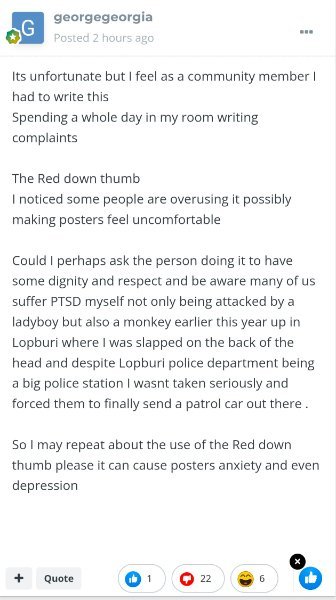 October 1, 2025Oct 1 On 9/26/2025 at 9:14 AM, georgegeorgia said: The Red down thumb I noticed some people are overusing it possibly making posters feel uncomfortable If you are uncomfortable, like many other members here who feel that they are antagonizing, you should be protected by the authorities. AN Forum Rule #11 states. You will not troll or stalk other members by misusing forum posts, private messages, reactions, emojis or by any other means. These members trolling with emoji's must be stopped, why are you suffering needlessly?
