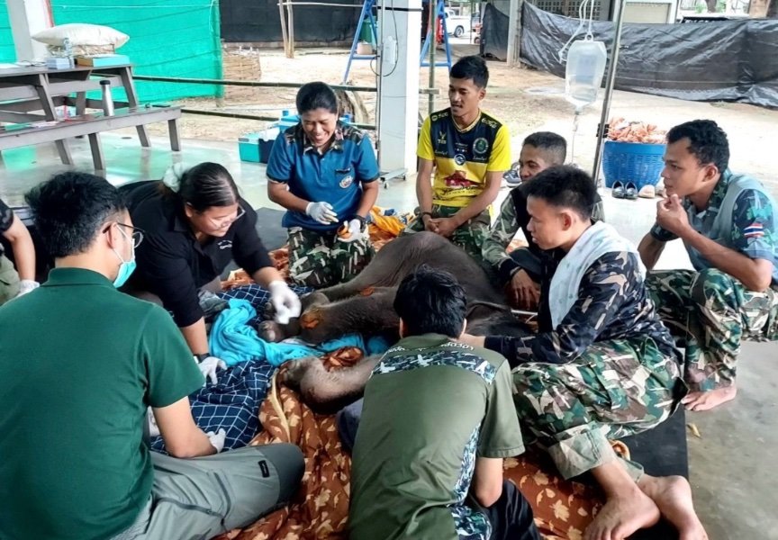 Veterinarians have reported gradual improvements in the condition of “Khao Tom,” a young wild elephant calf currently under care at Bueng Chawak Wildlife Sanctuary in Suphan Buri. On 27 September, the medical team confirmed the calf has begun drinking milk and water and is showing slight progress with its front legs following physiotherapy. However, blood tests continue to show elevated liver, kidney and muscle breakdown values and the animal remains weak.