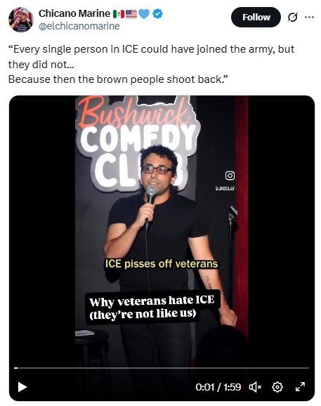 This is funny. A vet doing a stand-up talking about ICE - take a look.😄