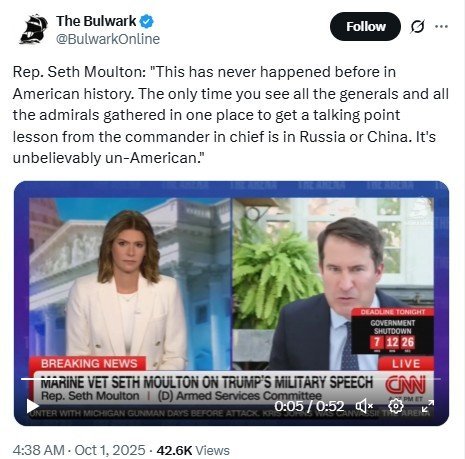 Naveed Shah, policy director for the veterans group Commons Defense, told The Guardian, "A lot of the words that are coming to me aren't fit to print. The people in that room who have served for 20, 30-plus years in uniform do not need Pete Hegseth to tell them about warrior ethos…. Certainly, addressing the troops could be useful or beneficial, but to call 800-plus generals and senior enlisted advisers from around the world into this room just before a government shutdown? It's not just bad optics or strategy. A bad cold could have threatened our entire chain of command."