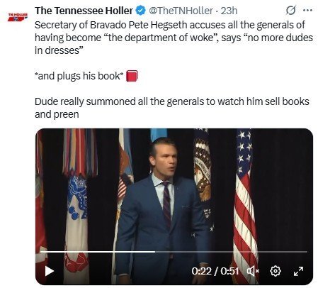 No intention of listening to the entire speech.  All can say is I agree with much of what I am hearing it contains.  There is no room for woke in a military.  If you are trans resign.  Doesn't mean I hate you or anything just that the military isn't the right career for you.
