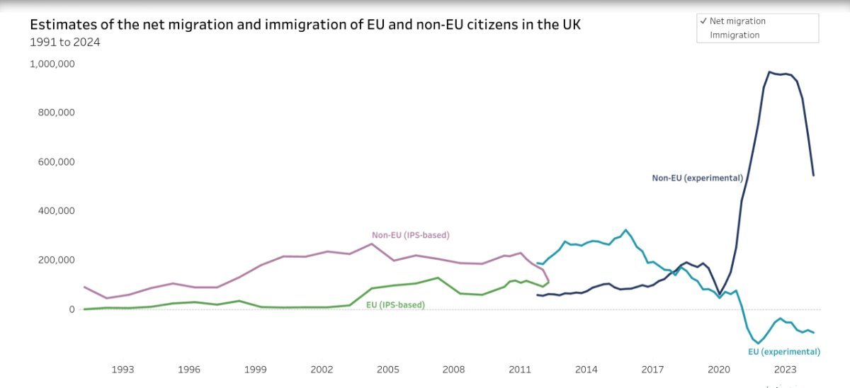 - Post-Brexit: EU net migration has turned negative — more EU citizens are leaving the UK than arriving. In 2024, EU net migration was –96,000.