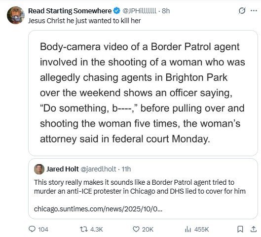 "Body-camera video of a Border Patrol agent involved in the shooting of a woman who was allegedly chasing agents in Brighton Park over the weekend shows an officer saying, “Do something, b----,” before pulling over and shooting the woman five times, the woman’s attorney said in federal court Monday.