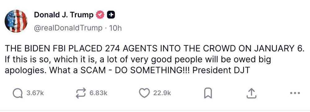But Donald, you were president on Jan 6th. Biden wasn't president until 15 days later. Biden had no FBI to send. Maybe you're confused and think he sent the secret service. Or maybe you're just senile...