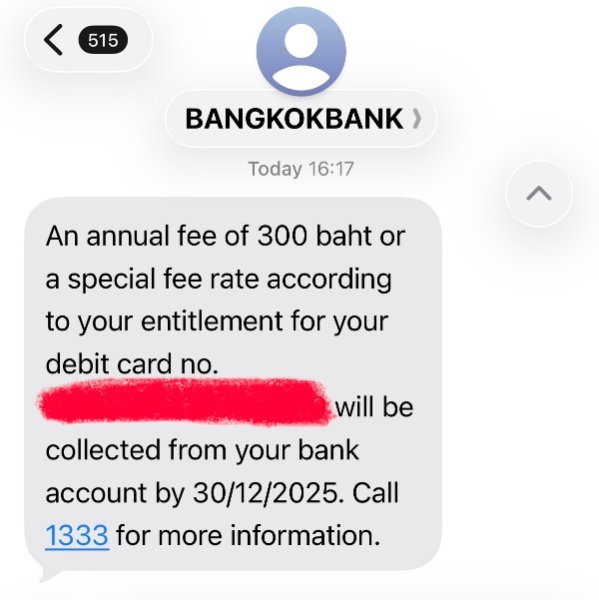 Bangkok bank annual debit card fee 300 BHT.