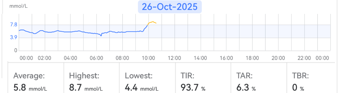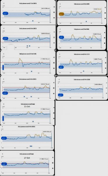 October 22, 2025Oct 22 Author Here's graphs (bottom) from the major testing day, and nothing like my Keto ish eating lifestyle. Last time tested my blood Glucose (May 2025) it was 5.3. Considering all the crap I've been shoveling in my face ever 3 hrs, amazing it's only about 6.3, according to the app. Making that high end of normal, before considered pre diabetic. Report for the 12 ish days ...
