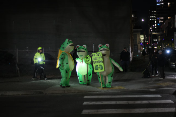 These people dressed as frogs represent the unusual behavior of the left in the USA.  I think they may need mental health counseling.