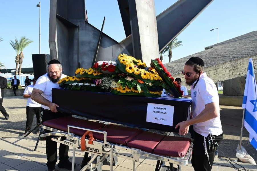 The Israeli Embassy in Bangkok on Thursday morning, October 23, 2025, posted photos and a message on its Facebook page stateting that a farewell ceremony was held near Ben Gurion Airport in honour of the Thai abductee, Mr. Sonthaya Oakkharasri, “who was murdered by Hamas on October 7, 2023.”