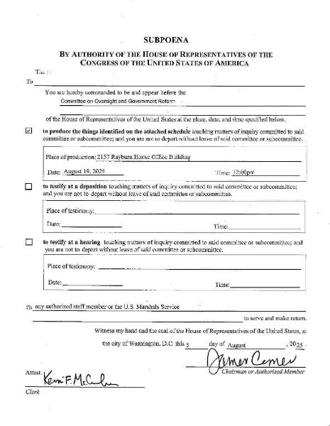 There is a link above to the letter Jack Smith via attorneys received from Jim Jordan. This is what a House subpoena from Jordan would look like: