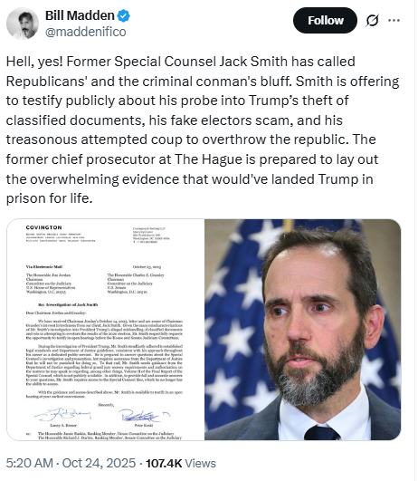 he's under subpoena already and must appear before congress on Oct 28 or face contempt of congress indictment. His bloviating and self serving comments , statements about testifying publicly are exactly that, "self serving"  and when the $hit hits the oscillatory rotor after the crossfire hurricane grand jury set to convene in January , of course jack Smith will take the opportunity to plead the 5th. Grand jury, rumored to convene in Jan 2026 will make Watergate look like a boy scout jamboree .