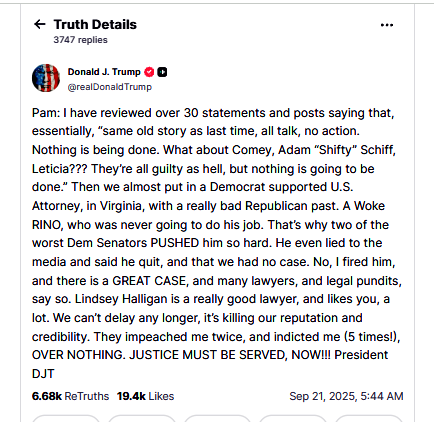 A day later, President Trump posted a statement on social media that provides smoking gun evidence that this prosecution would not have occurred but for the President’s animus