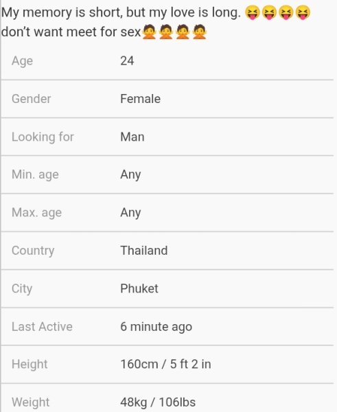 You're too kind, maybe it will be a disaster to see her again. I think the magic will be gone. At the moment though, I have the typical symptoms of someone who's been broken up with, you want her even more. And the worst she's telling me she wants to be with me. Yesterday again she said if I come to Phuket she'd be with me night and day.