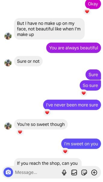So I drove to Central. In the car she texted me "But I have no make up on my face, not beautiful like when I'm with make up". I replied "You are always beautiful". She "Sure or not?" Me "Sure. So sure. I've never been more sure".. She "You're so sweet though". Me "I'm sweet on you".