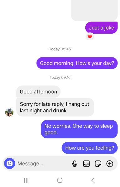 Maybe you're right. I sent a simple text "Good morning. How's your day". That was 3 hours ago. She hasn't read the message.