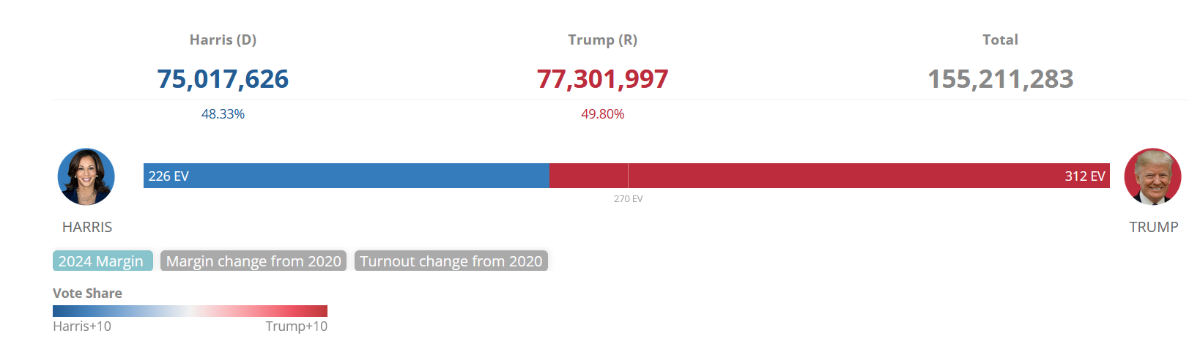 Trump won 77,284,118 votes, or 49.8 percent of the votes cast for president. That is the second highest vote total in U.S. history, trailing only the 81,284,666 votes that Joe Biden won in 2020. Trump won 3,059,799 more popular votes in 2024 than he won in 2020 and 14,299,293 more than he won in 2016. He now holds the record for the most cumulative popular votes won by any presidential candidate in U.S. history, surpassing Barack Obama. Running three times for the White House obviously helps.