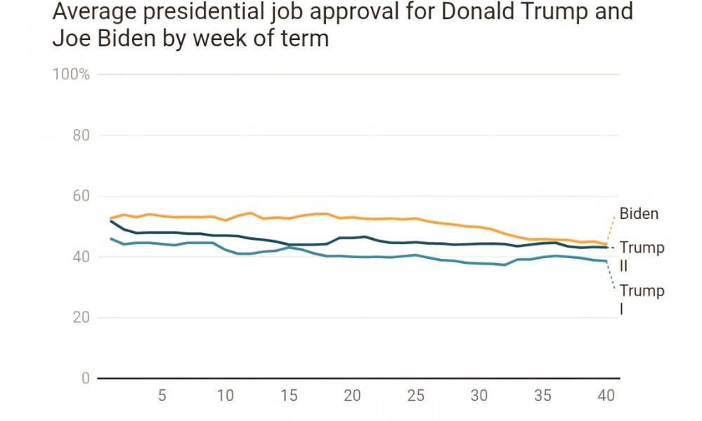 Ratings tend to go down over time. It happened for Trump 1.0, it happened for Biden, and probably also for Obama 2.0 (I didn't check). That's why the opposition often wins back the House and/or Senate after the midterms.