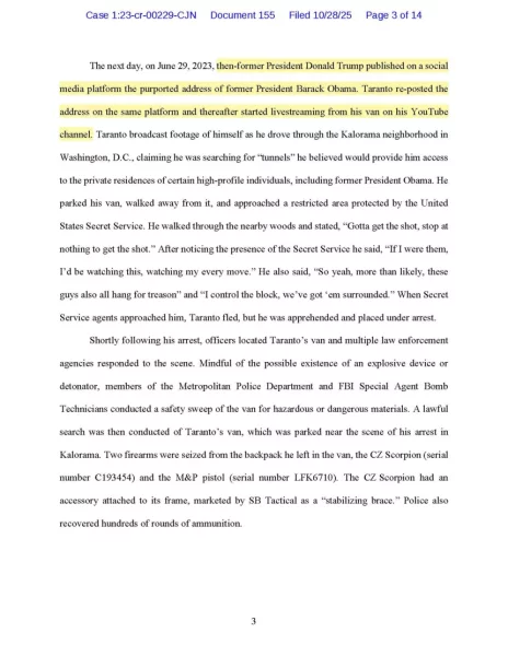 "then-former President Donald Trump published on a social media platform the purported address of former President Barack Obama,” Taranto had re-posted Trump “and thereafter started livestreaming from his van” as he drove through Obama’s neighborhood."