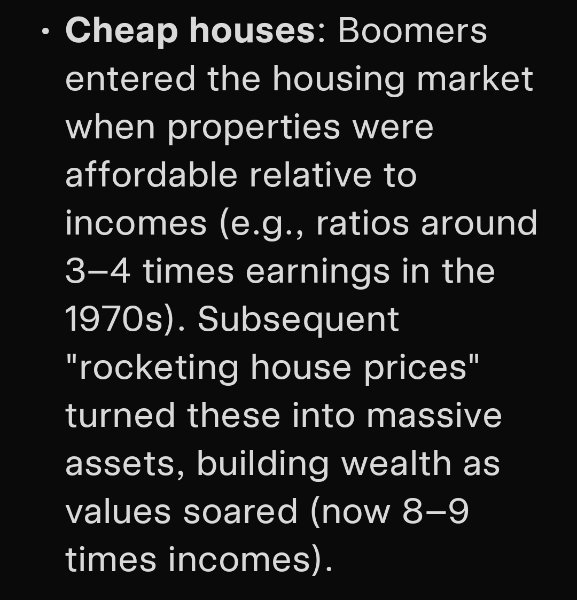 I had this conversation with a lad on Reddit. He seemed to think that boomers were deliberately trying to sabotage future generations. This just wasn't the case. People were just trying to get on the housing ladder, like people are today. It was expected that house prices would increase to give investment value and that there would be commensurate increases in salaries.  Prices increased but salaries stalled for whatever reasons. With AI/automation looming there will be fewer jobs which will compound the situation. It's not looking bright.