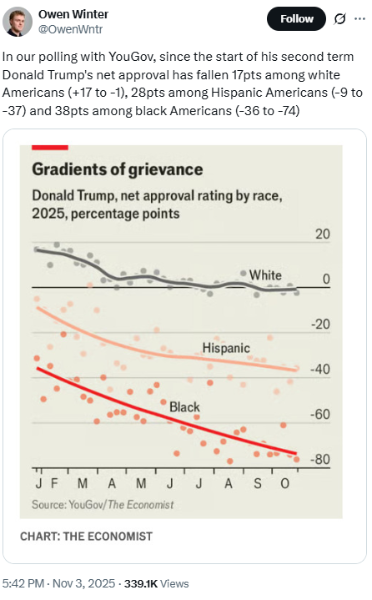 What difference does the polling make?  He is not going to allow mid-term elections let alone 2028 general elections.  He will get us into a war with Venezuela or Nigeria and use the war powers act to cancel elections.  "Oceania had always been at war with Eastasia."