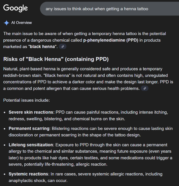 “Black henna is popular for its dark pigment, resembling a real tattoo. However, it contains paraphenylenediamine (PPD), a chemical legal in hair dye only under strict conditions. “