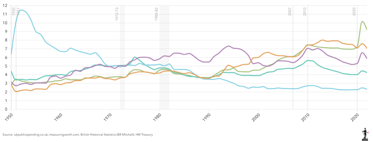 Social Services spending has increased significantly in the UK over the past 75 years.