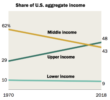 Again if we  look at the USA as an illustration, although the upper income have increased their share of aggregate income, the lower income have remained fairly constant. It is the middle income who have seen their  share decrease.  However, middle income people are not the ones panhandling and harassing people on the street, or mugging kids and the elderly. Therefore, the claim that income inequity is responsible for the problems we see today is not a conclusion supported by the data. The data below is from the US Pew Report on Income.   It also observed that " The decline in the middle-class share is not a total sign of regression. From 1971 to 2019, the share of adults in the upper-income tier increased from 14% to 20%. Meanwhile, the share in the lower-income tier increased from 25% to 29%. On balance, there was more movement up the income ladder than down the income ladder."