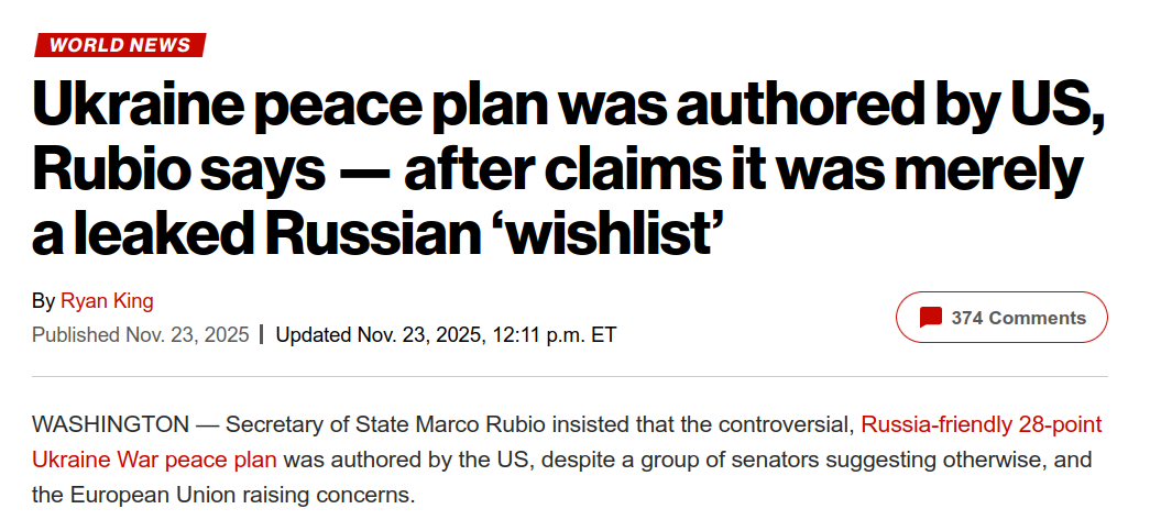 The State Department moved sharply on Saturday to shut down growing claims from U.S. senators that President Trump’s controversial 28-point Ukraine peace plan originated in Russia rather than Washington. The pushback came after PBS NewsHour’s Nick Schifrin reported comments from Sens. Mike Rounds and Angus King suggesting Secretary of State Marco Rubio had told them the plan was “received” from an intermediary and amounted to “the Russian wish list.”
