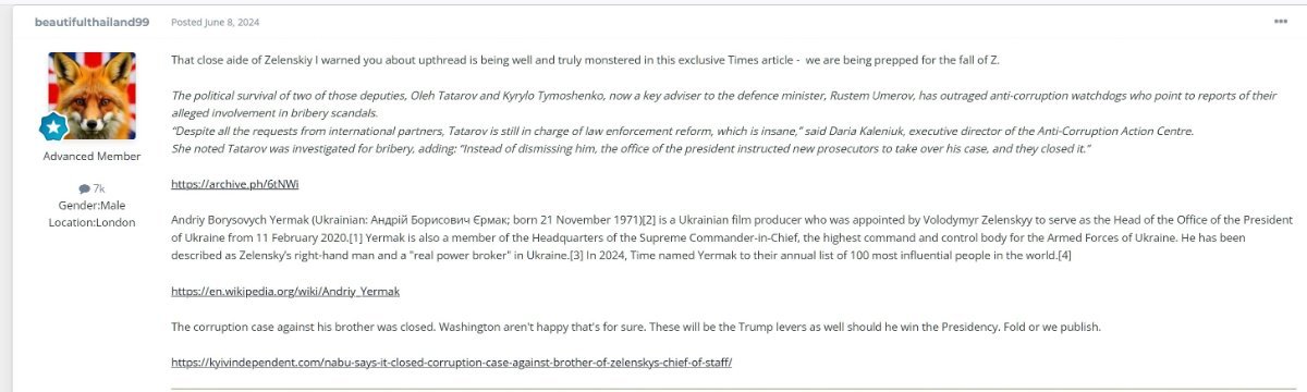 According to the excellenmt Kyiv Independent - Zelenskiy has to get rid of his whole inner circle - the war cabinet and maybe even himself  such is the whiff of corruption about the whole thing. Rumours circulate that Trump / CIA helped with some of the details to hlep the story grow wings. That Trump is effectively a Russian assett is basically a given at this point. We are nearly at the point of the fall of South Vietnam now, choppers on the roof. Zelenskiy does have the cards but is a house of cards and it's collapsing.