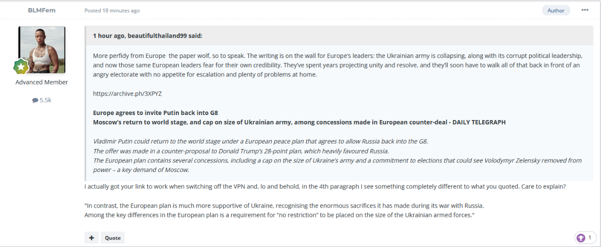 November 25, 2025Nov 25 21 hours ago, beautifulthailand99 said: You’re quite mad but I’ll engage regardless. What lie, exactly? I offered a personal commentary based on my own informed opinions and cited a Telegraph article suggesting the G7 might even consider bringing Russia back into the fold a rather salient point that doesn’t quite fit with your “Putler” nonsense. And let’s be honest: Europe would never have entertained the idea of welcoming Hitler back into polite diplomatic circles in the middle of World War II. Yet today, those same Western leaders who posture as moral absolutists are apparently willing to discuss reintegrating Putin. The contrast speaks for itself. Are you, or were you ever a Communist, or variants of?