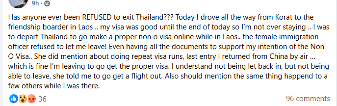 • For all intents and purposes the land borders with Lao are closed to bouncers.  Doesn't matter what your entry/say history is, they will not let you stamp out and just turn you back at passport c
