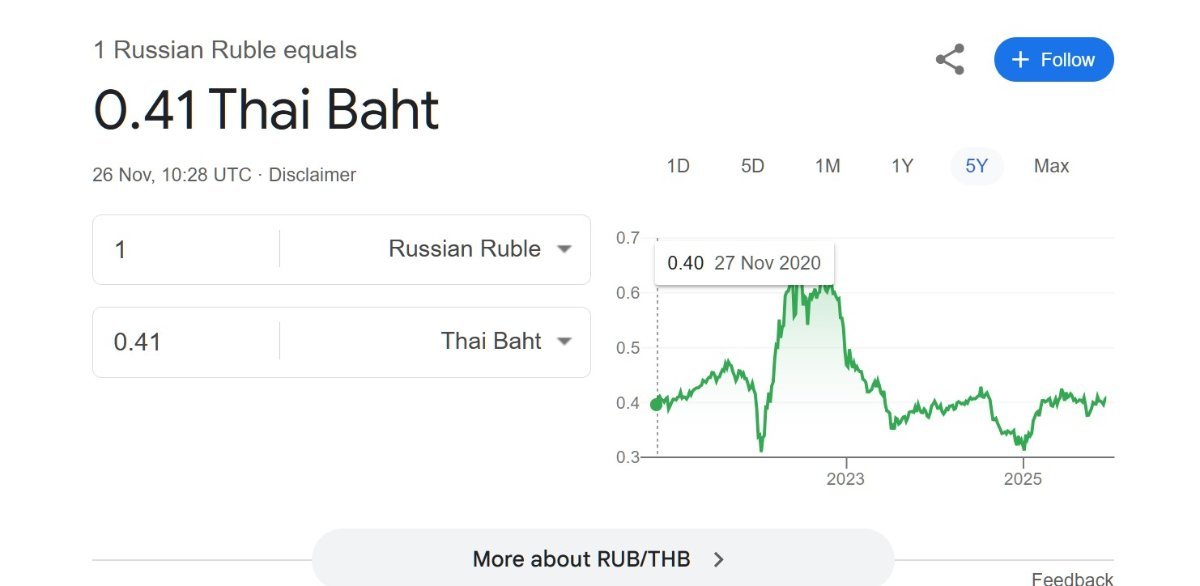 The Ruble / Baht is back to the 5 year trend - the war has hardly impacted the price it had pre war. So the answer is probably more, it's baked in and there number one destination where the host country doen't care what they get up to elsewhere.