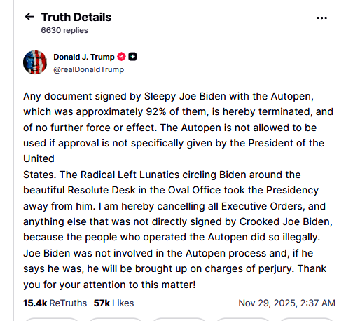 The autopen is a recurring thought in Trump's unsophisticated thinking. Another one is Obamacare. Another is Epstein. Another is brown people immigrating.