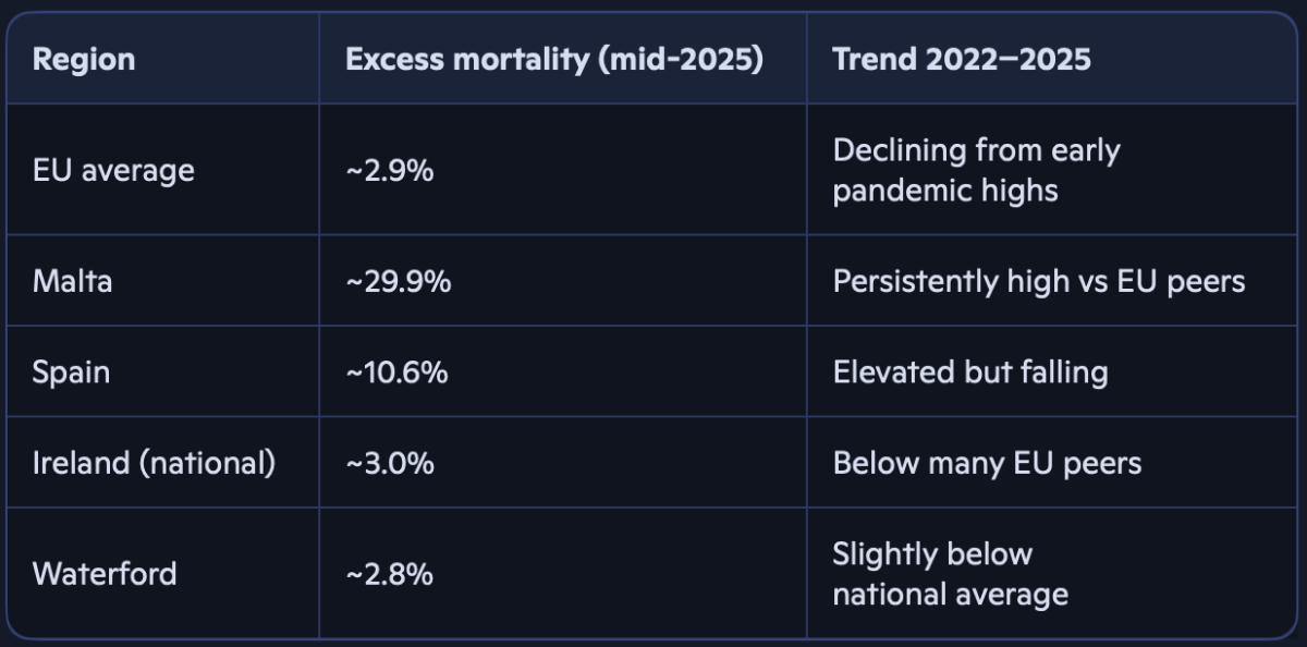 Waterford’s record‑breaking vaccination rate is real, but the claim that it now suffers the highest excess deaths “as a consequence” is not supported by official statistics. Excess mortality in Ireland is significant but sits within European norms, and Waterford is not singled out in the data.