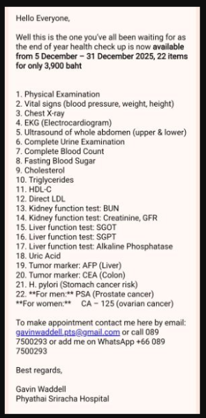 December 12, 2025Dec 12 32 minutes ago, bbi1 said: How much did you pay for what you mentioned above? Not sure, but only had 3 test done last time, May 2025, <1000 ? ... Lipid panel (Lipoprotein) Lp (b) HbA1c Prior to that, Nov 2024, just blood work, done elsewhere, clinic @ Hua Hin, I think price about 3500 ? Expensive compared to PhayaThai promo, especially since didn't really care for half of the test, but was a package. No wait, walk in, take blood, email results. I was there, and just happen to be around the corner from place I was getting an eye exam, so thought, why not. Lab work actually done @ HH Hosp. Use to get almost yearly check ups at Camillian hosp at BKK. EKG, Xray, ultrasounds & bloodwork, but last one 2020, <7000 baht https://camillianhospital.org/en/health-check-up-program/ I don't bother with all the test now, and only concerned about these, which last 2, I haven't had done yet. Which, if I make to Phayathai, will add them on: Lipid panel (Lipoprotein) Lp (a) ... just once in life time Lp (b) HbA1c HSCRP HOMA-IR