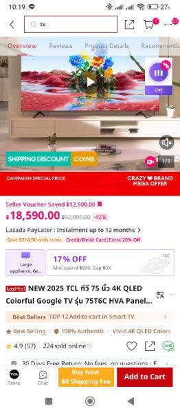 • TCL 75" 14,400 from Lazada through the TCL Official Store on 12.12 sale. https://s.lazada.co.th/s.Z0KyNy