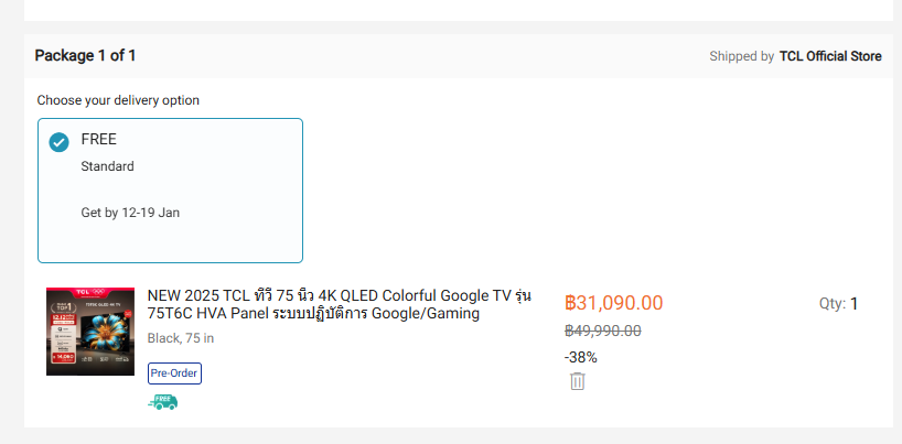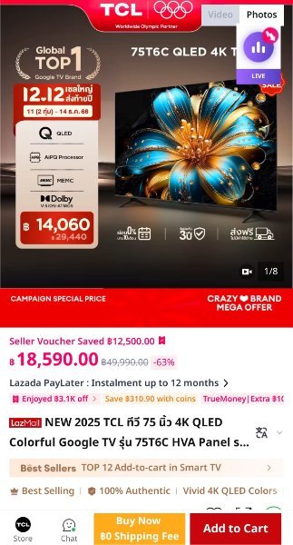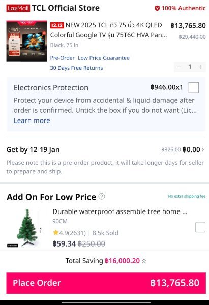 • TCL 75" 14,400 from Lazada through the TCL Official Store on 12.12 sale. https://s.lazada.co.th/s.Z0KyNy