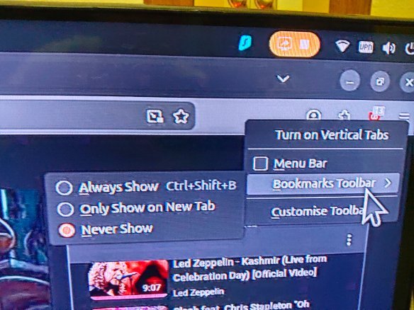 December 16, 2025Dec 16 An alternative to my solution above, when in Firefox, CTRL+Shift+B toggles between showing and hiding the bookmarks toolbar