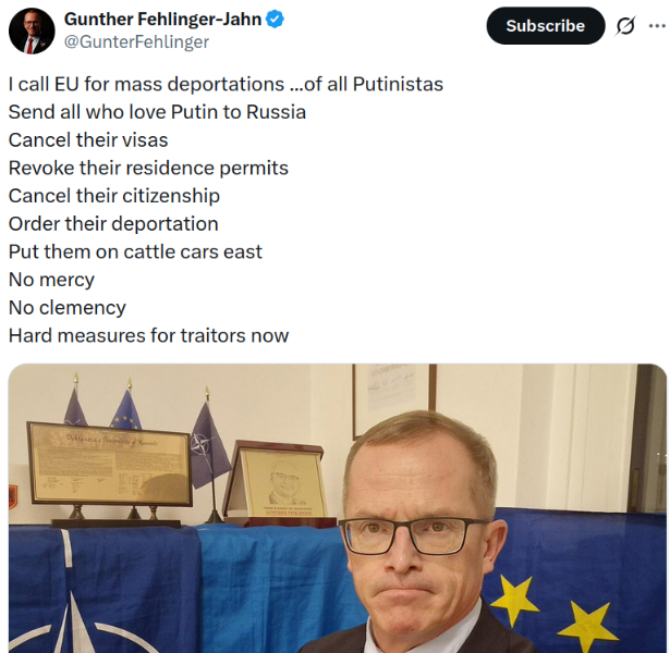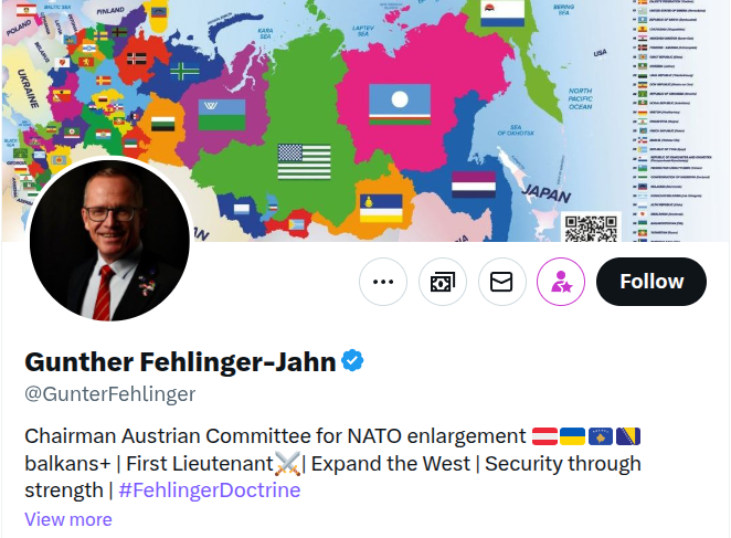 Yep, that's very Fourth Reich rhetoric that is coming out of Mr. Fehlinger-Jahn's mouth.  Of course, when those of us who study historical Geo-politics brings the fact that post-Soviet Russian leaders were assured that NATO was not going "one inch to the East" in the 1990s, and then they end up on the Russian border arming and equipping the largest army in Europe (Ukraine), with the like of the head of EU Foreign Affairs, Kaja Kallas and her acolytes such as Gunther Fehlinger-Jahn and others in the European Union openly calling for the break-up of The Russian Federation (rosily termed "decolonization") - well?  That sort looks like a existential threat to the sovereignty of The Russian Federation as well as the "root cause" of the current conflict in Ukraine.