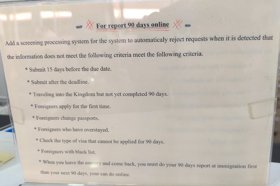 December 28, 2025Dec 28 On 12/27/2025 at 9:03 AM, scubascuba3 said: Have you already done the in person report following the passport change? if so try inputting your new passport number to the online system, mine is now on there. On Oct 8 I was there for transfer of stamps and extension with the new passport. Very quiet day, no waiting at all! After that I went to that "90 day room/desks" where I got a new 90 report slip for due date Jan 5. BUT! On my useless/hopeless visit last Friday I was told that this counter is not for "farangs" just Lao etc. What?? Make of it what you like. On Jan 7 I will drive there again. Hope for the best but be prepared to hang around for hours? This morning did a third attempt for online. In a way just measuring how long the reject takes on a weekend.