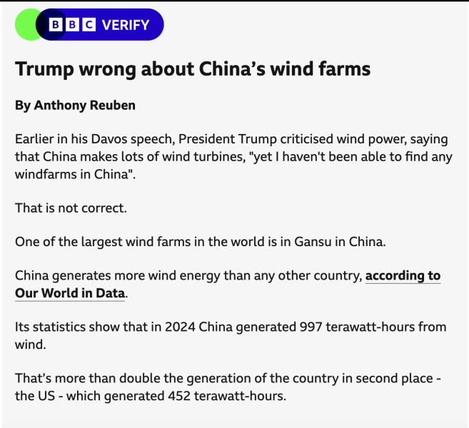 Trump just made an idiotic comment at Davos. Not that anyone is surprised. He can't find any wind farms in China apparently.