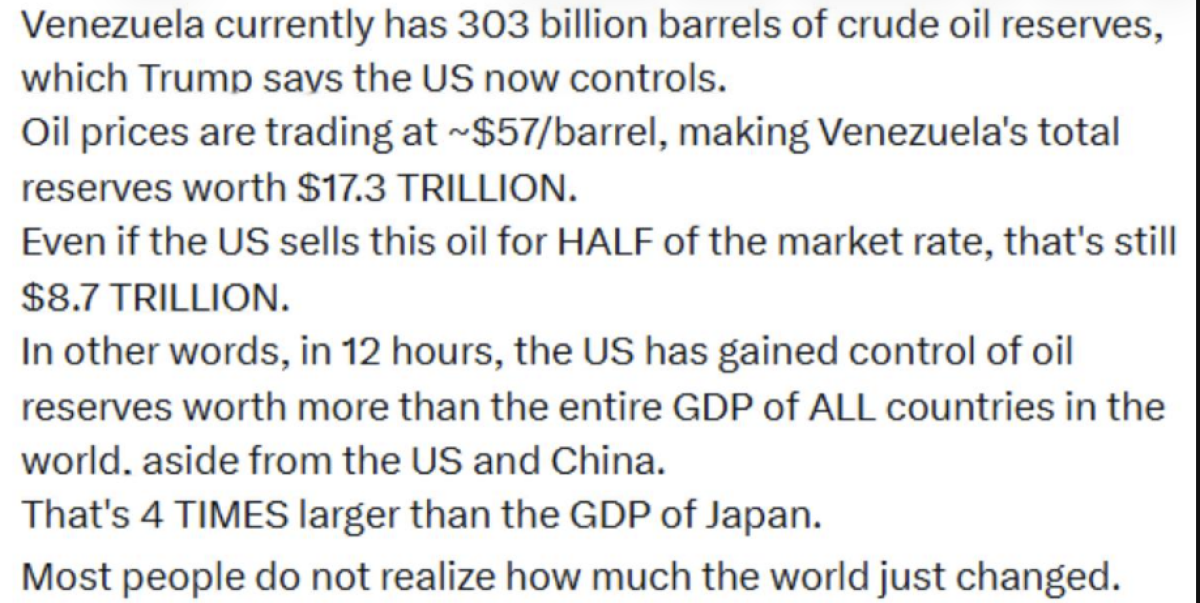 I don't quite understand Trump's statements or all the excitement announcing a big change, since there hasn't been a regime change in Venezuela. There are other members of the Maduro government who are in power. The elected opposition that was denied power is still out of power and the Maduro faction or whatever they are called now are still running things. Aside from Maduro being taken to the USA, obviously with assistance from Venezuelan administration members, has anything actually changed?