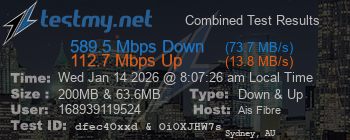 January 14Jan 14 TestmynetSydneyAIS Fibre 1,000/500On 1/6/2026 at 5:22 PM, flipper2222222 said:Have fast domestic speeds but Australian traffic is woeful,Can you share any details? Your AIS fiber connection worked fine until recently? Or has this been an issue since installation?