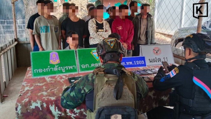 Authorities in Thailand have detained 16 Myanmar nationals attempting to cross into Cambodia illegally. The men were apprehended by the Burapha Task Force, an army ranger unit, and Khlong Nam Sai police in Aranyaprathet district, Sa Kaeo province. The group was discovered walking along a farm track in Nong Prue village without any travel documents.