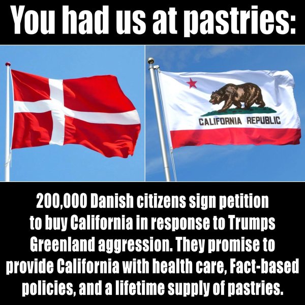 Nope we californios along with Washington and Oregon want to join Canada good health care and we could be the gateway to Asia.