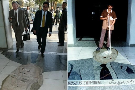 Left – In November 2002, members of the United Nations team of weapons inspectors walk over the mosaic of former US President George HW Bush [Awad Awad/AFP].