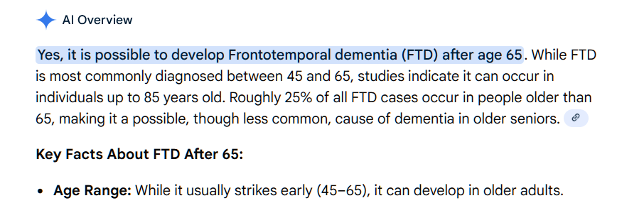And once again, relying on AI to summarize medical conditions and diagnosis results is an inaccurate dumping of information. FTD is is commonly misdiagnosed. There can be other illnesses that are misinterpreted as FTD. An example is motor neuron disease. Vascular disease can result in people being tired. However, the fact is that the man is almost 80 years old. He is working at a pace that wipes out younger people.