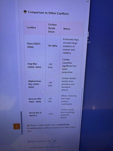 Why don't you ask AI what is considered by the laws of war to be acceptable collateral damage. Also bear in mind that AI gathers information to come up with answers. This is an example from your post. "The final civilian death toll will probably be considerably higher than 70,000." The death toll figures are given by Hamas. The MSM run with these figures. AI like Google's Gemini gathers information from MSM.