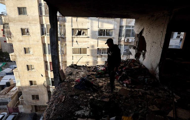 Video showed charred, blackened and destroyed walls at an apartment in a multi-storey building, and debris scattered inside it and outside on the Gaza City street.