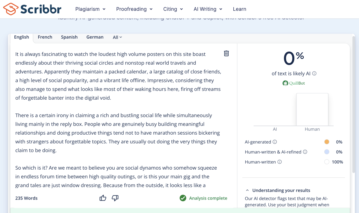 February 16Feb 16 Popular Post 1 hour ago, richard_smith237 said:Why assume it’s AI at all?Three AI detection tools say it’s entirely human / One claims it’s entirely AI.The reality is that it’s becoming increasingly difficult to tell the difference between AI and huma content, particularly when someone writes with clarity and a solid grasp of English. Structure, grammar and coherent reasoning are no longer indicators of authorship - they’re simply indicators of competence.When I’ve checked some of my own comments, the results are all ranging, occasionally flagged as 100% AI, more often hovering around 50%, sometimes higher, sometimes lower.Perhaps the more interesting question is why fluency now invites suspicion in the first place.I honestly do not think it makes much difference who writes the text you are reading online these days. These posts are not meant to be works of fine literature. They are simply a form of digital communication, and everything is anonymous anyway. Nobody knows each other. So whether it is an anonymous member you have never met or an AI tool, it seems to make little difference. What really matters is the content. Many news articles on this site are partially written with the help of AI, and people read them without hesitation. In my view, it is the message that matters, not the messenger.Take one of the most prolific topic starters on this forum as an example. His ideas are often repetitive, rhetorical, and poorly expressed and most of all, uninteresting. I doubt AI could meaningfully improve that. Just look at his site reputation score, it speaks for itself.On the other hand, if someone has interesting ideas but struggles to express them clearly, and uses AI to turn those ideas into well written text, I would much rather read that than something difficult to follow. Many people draft their thoughts first and then use AI to refine them. What you are reading here in this OP may be largely human work, with some AI assistance for editing and clarity. In the end, there is still a person behind the overall idea and direction.If someone has thoughtful insights but lacks strong writing skills, would you not prefer to see those ideas presented clearly rather than struggle through confusing sentences?There are a couple of posters for example with the initials GG who might both greatly benefit from the use of AI writing. Most of their posts are disjointed and difficult to follow, so much of the time I don’t even read what they post.Much of what is written online today is a mix of human input and AI support. That also makes it harder for detection tools, like the ones you mentioned, to draw firm conclusions since very little content is likely to be entirely generated without any human involvement. But this brings me back to my main point. As long as the content is engaging and easy to read, that is what matters. At the end of the day, it is simply words put together to express an idea. It is not a fabricated image or video intended to mislead anyone.